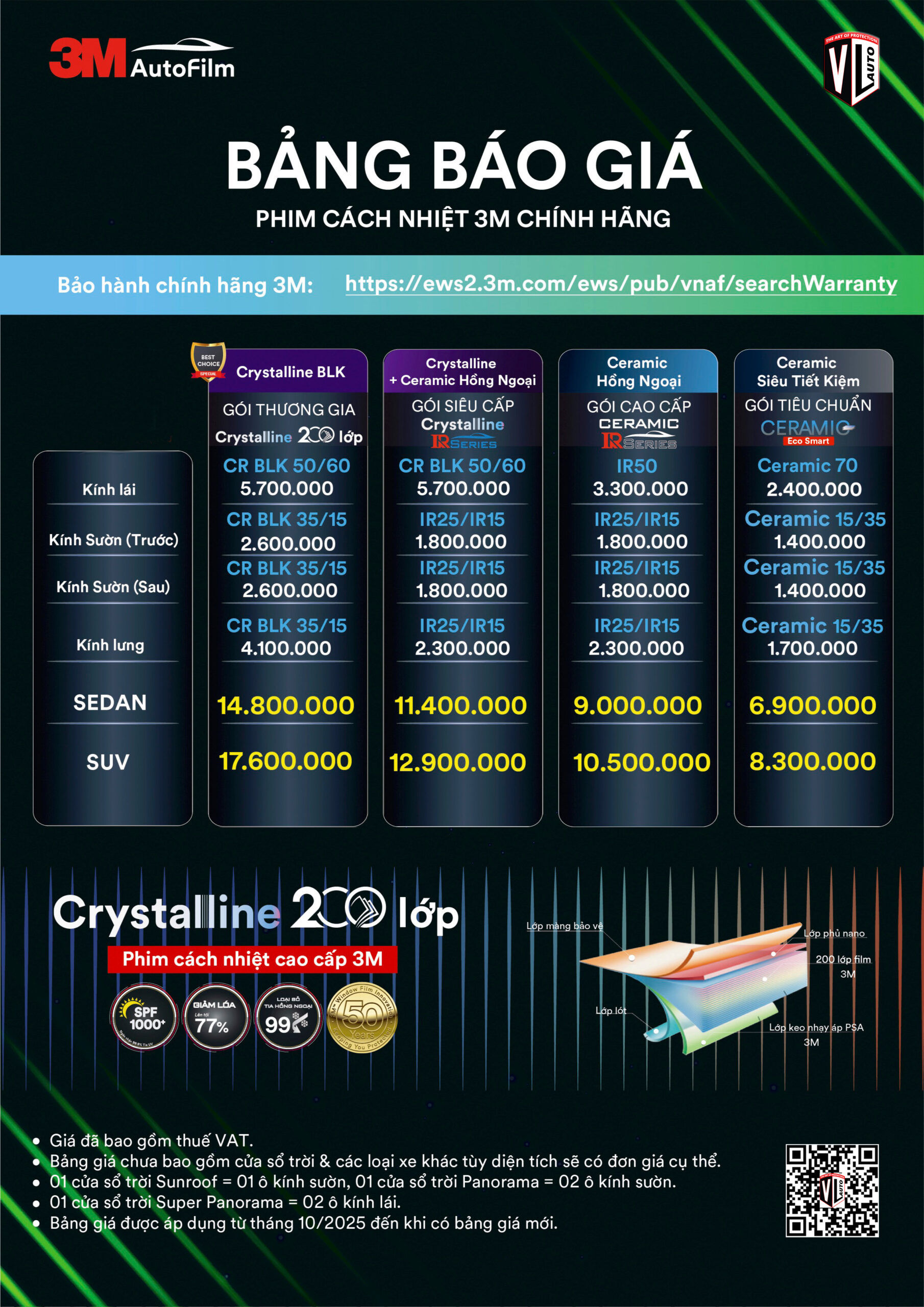 Chi phí dán phim cách nhiệt cho ô tô có thể khác nhau tùy thuộc vào một số yêu cầu như loại xe, đời xe, độ truyền sáng của phim cũng như lựa chọn các gói dán phim cách nhiệt 3M (Gói 3M Crystalline, gói 3M Ceramic IR hồng ngoại hoặc gói trộn giữa 2 loại phim).