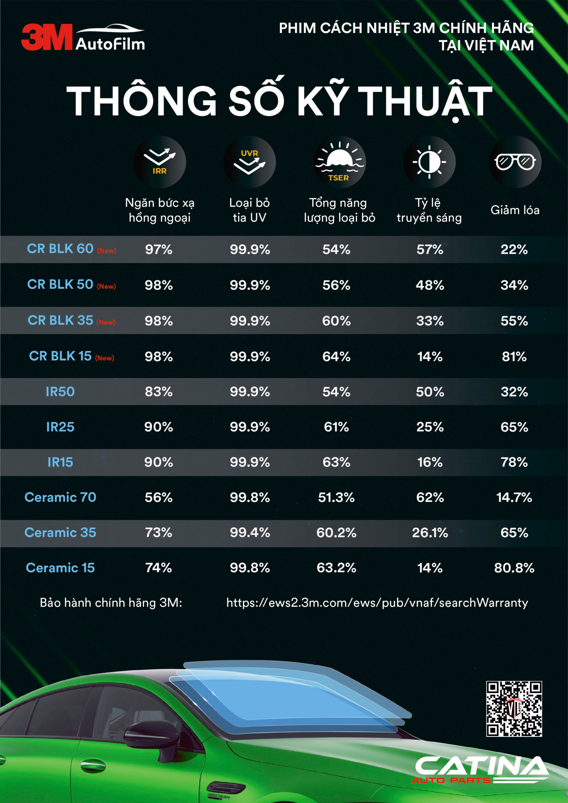 Bạn có thể tìm hiểu thêm về phim cách nhiệt ô tô dòng 3M IR 50, IR 25, IR 15 hoặc tham khảo thêm bảng giá dán phim cách nhiệt 3M Ceramic hồng ngoại .